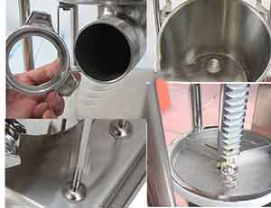 Lắp sẵn phễu đùn xúc xích vào máy. Tùy vào nhu cầu, bạn có thể chọn các kích cỡ 15-20-30-35mm.
